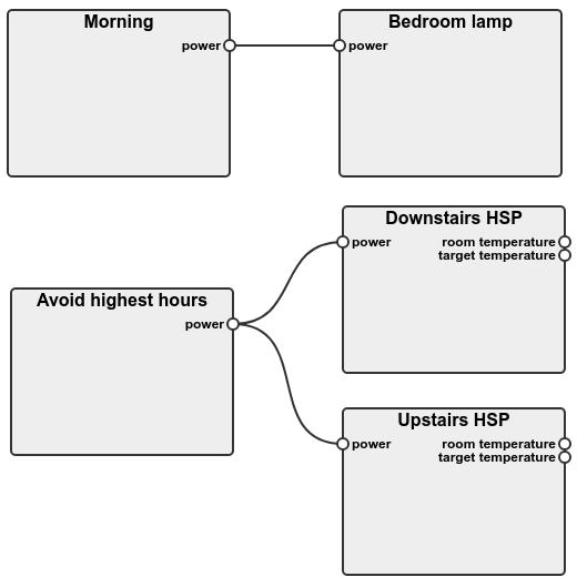 ePower is a home automation software, mainly for Raspberry PI devices. The idea is to represent your devices as simple nodes, that you can connect to each others.